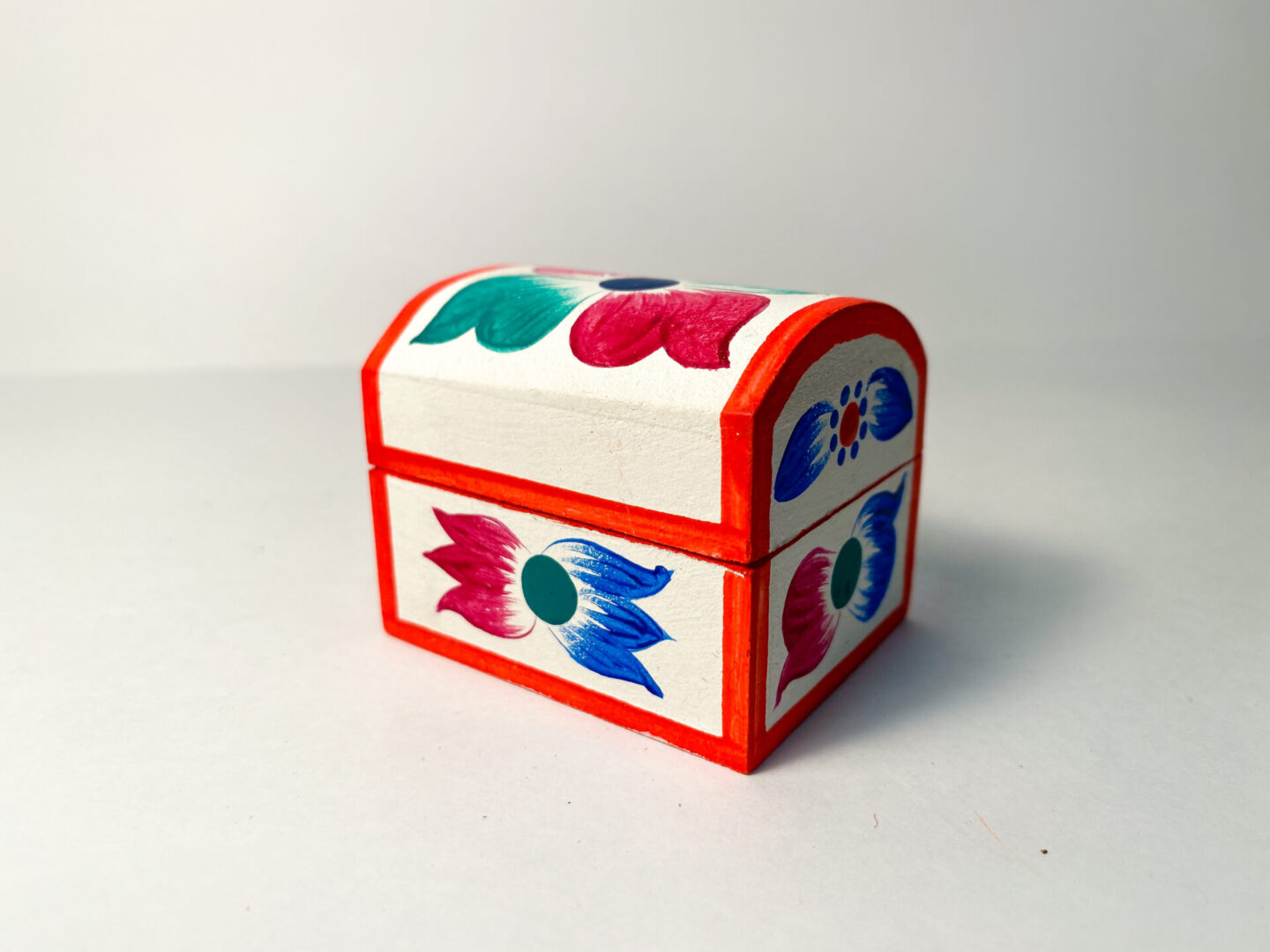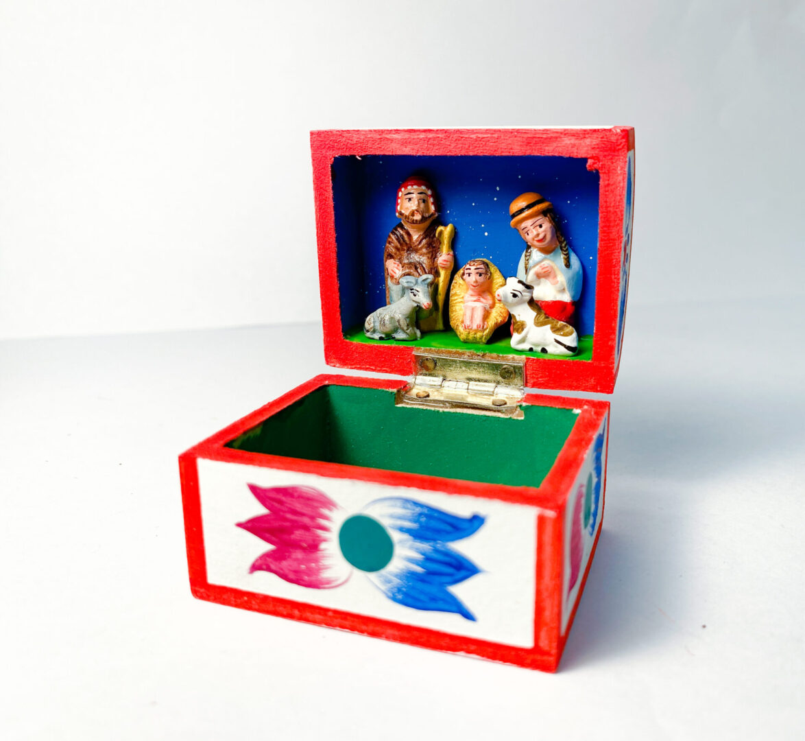 A beautifully decorated small box with a nativity inside the top cover. Perfect for storing small jewelry. Handcrafted in Peru.